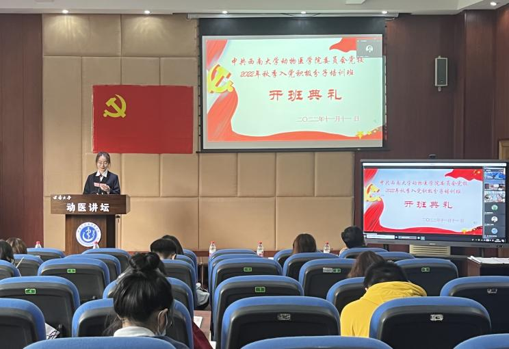 党校2022年秋季入党积极分子培训班开班典礼在荣昌3110室、10教207室及线上腾讯会议隆重举行。学院党委书记、学院党校校长黄昌建,学院党委副书记、纪委书记、学院党校副校长黄庆洲,学院党委委员、学院副院长宋振辉,学院党委委员彭远义、王鲜中、甘玲,学院党校辅导员,学生支部书记及96名入党积极分子参加本次开班典礼。