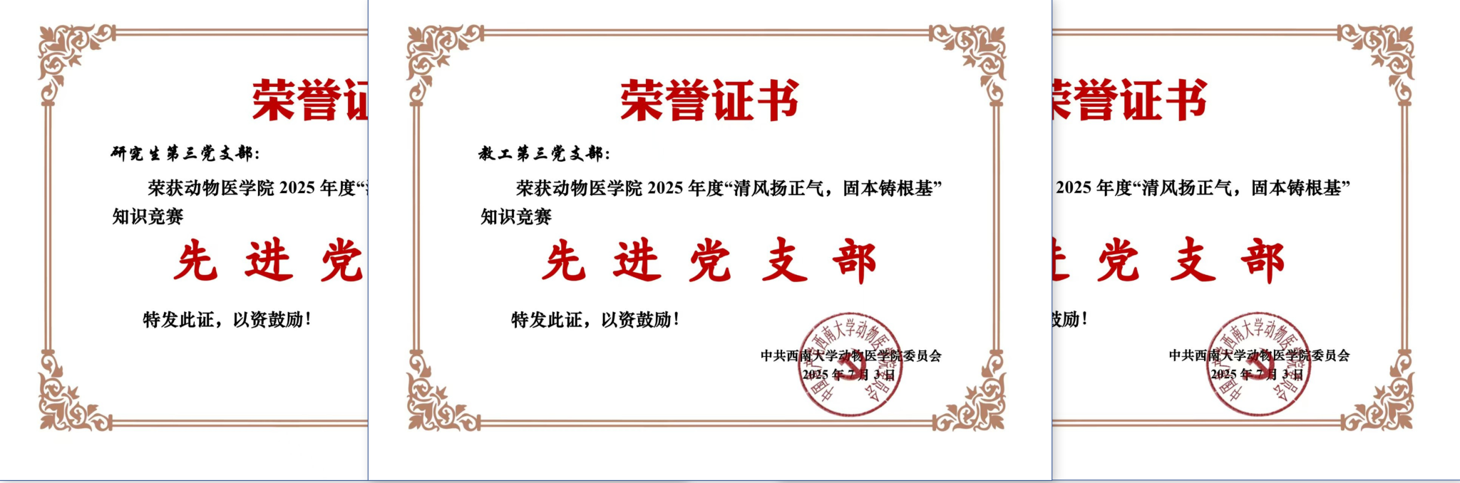 活动期间,各支部精心组织,累计收到有效答卷404份,充分展现了师生对廉洁知识学习的高度重视。经综合评定答题成绩与支部平均分,竞赛最终评选出教工组和学生组个人共10人获“卓越奖”,27人获“优秀奖”。同时,教工第三党支部、本科生第四党支部、研究生第三党支部荣获“先进党支部”。