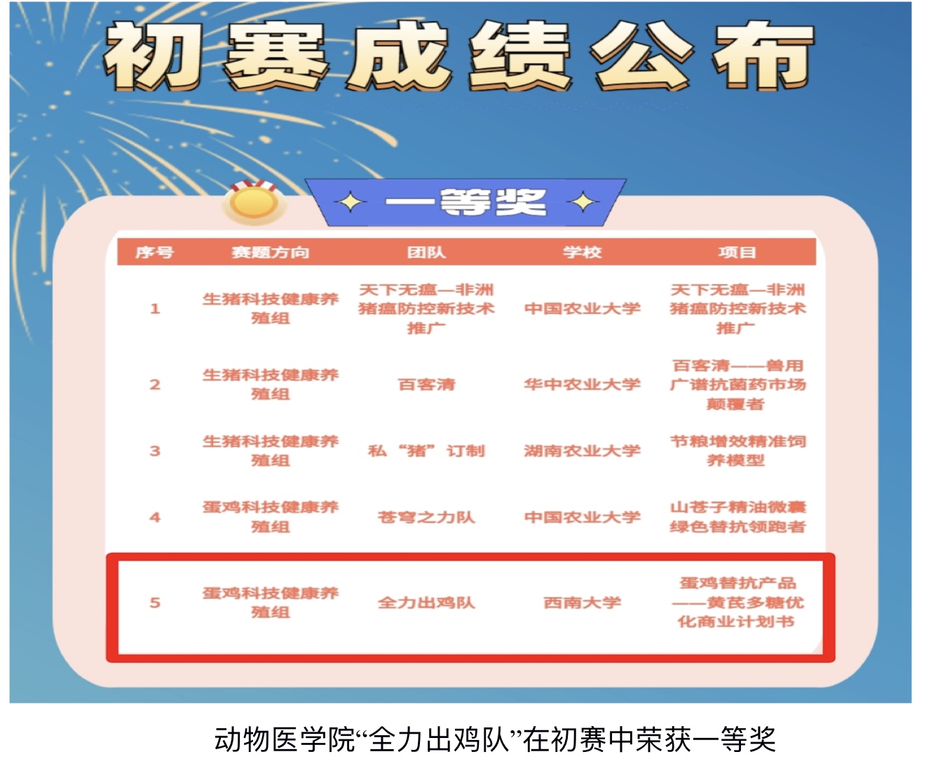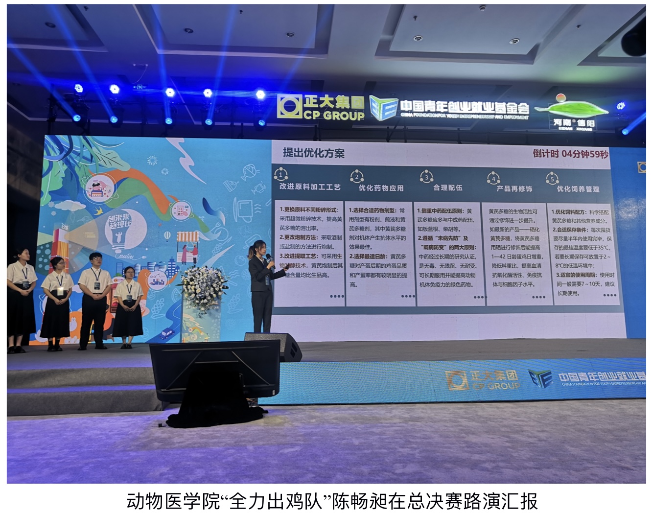 万金梅、陈畅昶、赵茂琳、刘嘉仪和魏辰宇五位同学组成的“全力出鸡队”在易华山副教授的指导带领下,“蛋鸡替抗产品--黄芪多糖优化商业计划书”项目在初赛蛋鸡科技健康养殖组中以一等奖的佳绩晋级全国总决赛,最终,51风流