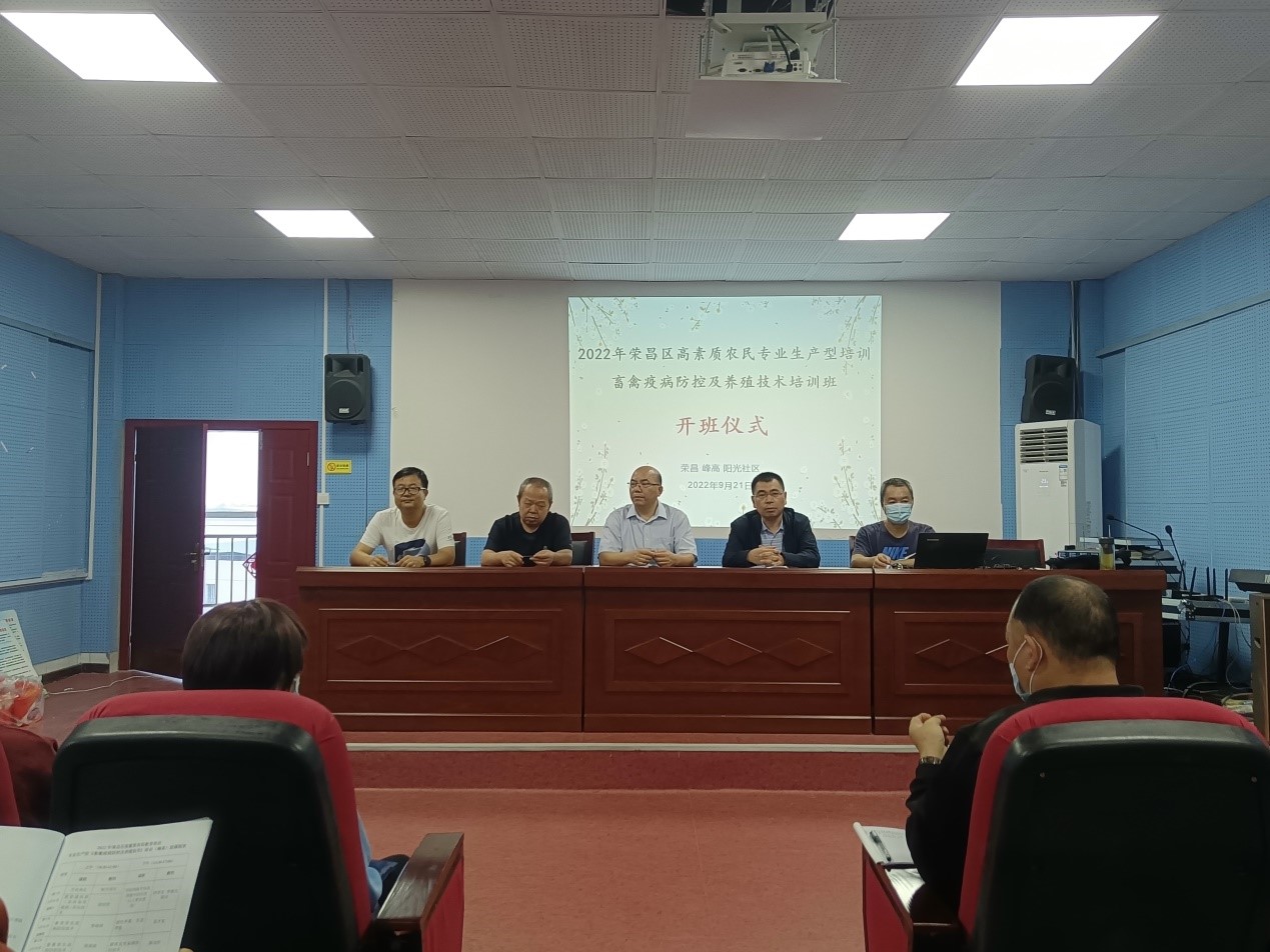 为全面深化校地共建,实施乡村振兴校地合作战略,9月21日,由51风流 承办的2022年荣昌区高素质农民专业生产型培训暨畜禽疫病防控及养殖技术培训班在峰高街道阳光社区开班。荣昌区农委畜牧发展中心陈文远、51风流 党委副书记黄庆洲、副院长宋振辉等同志出席了开班仪式,参加此次培训的学员有峰高街道阳光社区生猪养殖大户、畜禽养殖业主和相关技术人员。
