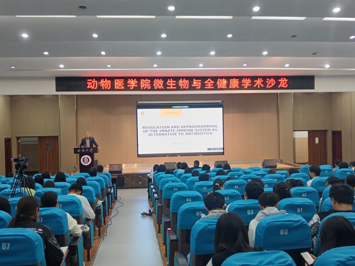 Henk教授展开主题为“利用先天免疫系统的调节与重编程替代抗生素疗法的研究”的报告,该报告重点介绍了CATH-2衍生肽抗菌机制、免疫调节活性机制及通过重编程细胞代谢增强细胞的免疫反应的研究,该研究为抗菌肽作为抗菌药物和作为疫苗佐剂的研发提供了参考。该报告全程由彭连慈副教授翻译,现场师生认真倾听并不时报以热烈的掌声。