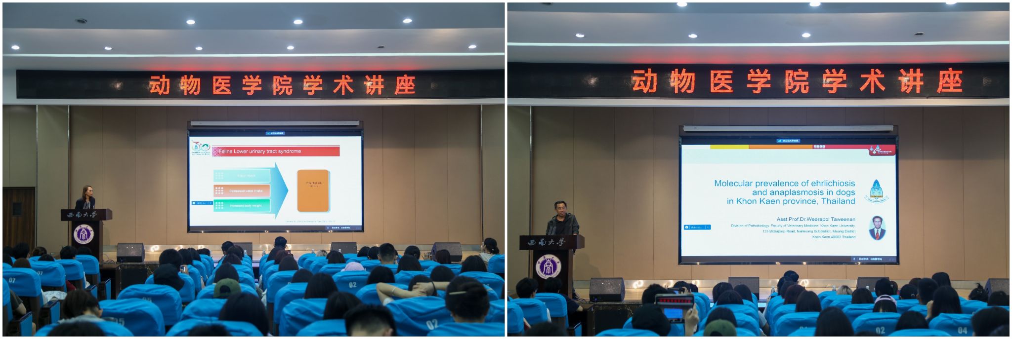 Weerapol Taweenan副教授对泰国孔敬省犬艾氏体病和无浆体病的分子流行率进行了分析;Supranee Jitpean副教授针对小动物临床病例-猫下尿路综合征的内科和外科治疗进行了讲解。师生们认真聆听,热情高涨,积极互动。