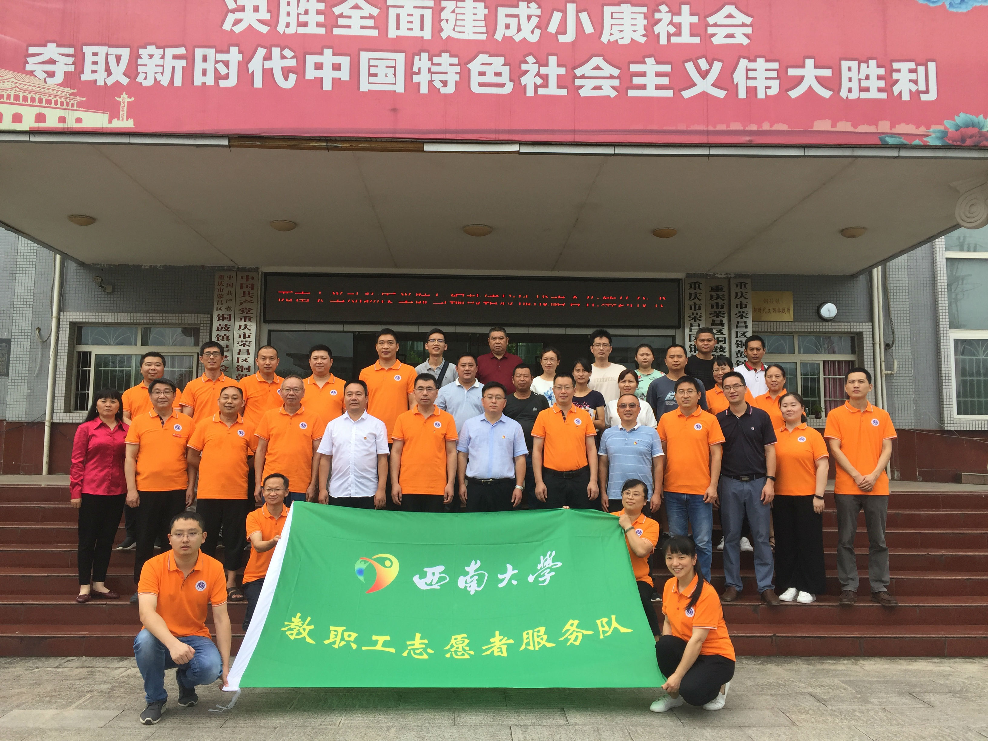 教职工暑期三下乡志愿者服务队来到重庆市荣昌区铜鼓镇开展了“学党史、办实事、助力乡村振兴”的三下乡活动。在党委书记黄昌建,党委委员、副院长宋振辉,工会主席王芝英的带领下,教师党员、科技特派员、工会会员共约三十余人积极参与其中、通过切身实践贯彻三下乡的精神方针,将科技知识带向铜鼓镇的广袤田野。