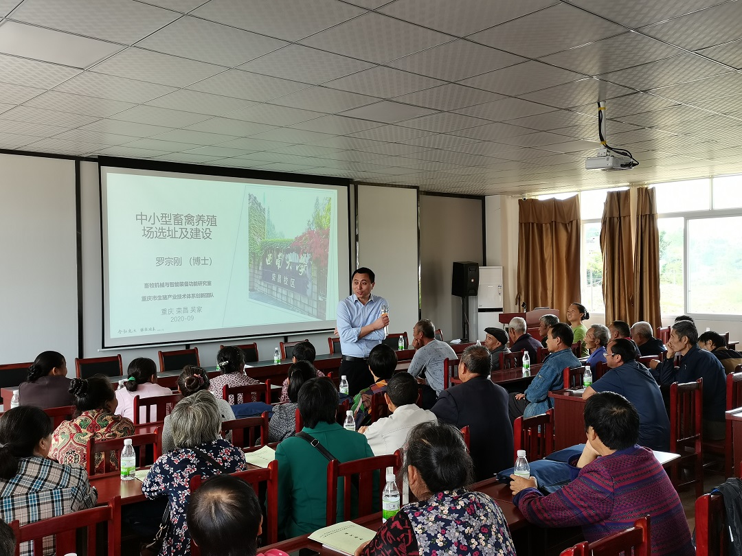 党委副书记黄庆洲,荣昌区畜牧发展中心宣传信息科科长郝静,代兴村党总支副书记邓元兵。与会领导分别从本次培训班的意义、师资力量安排、培训方式、对学员培训到位及安全要求等作了全面说明,希望学员珍惜机会,认真学习,把畜禽养殖中出现的问题多向培训专家请教,把畜禽养殖做大做强,为促进养殖增收致富贡献力量。开班仪式后罗宗刚为学员进行了第一个专题培训“中小规模畜禽养殖场选址设计及建设”,参训学员反映收获很大。
