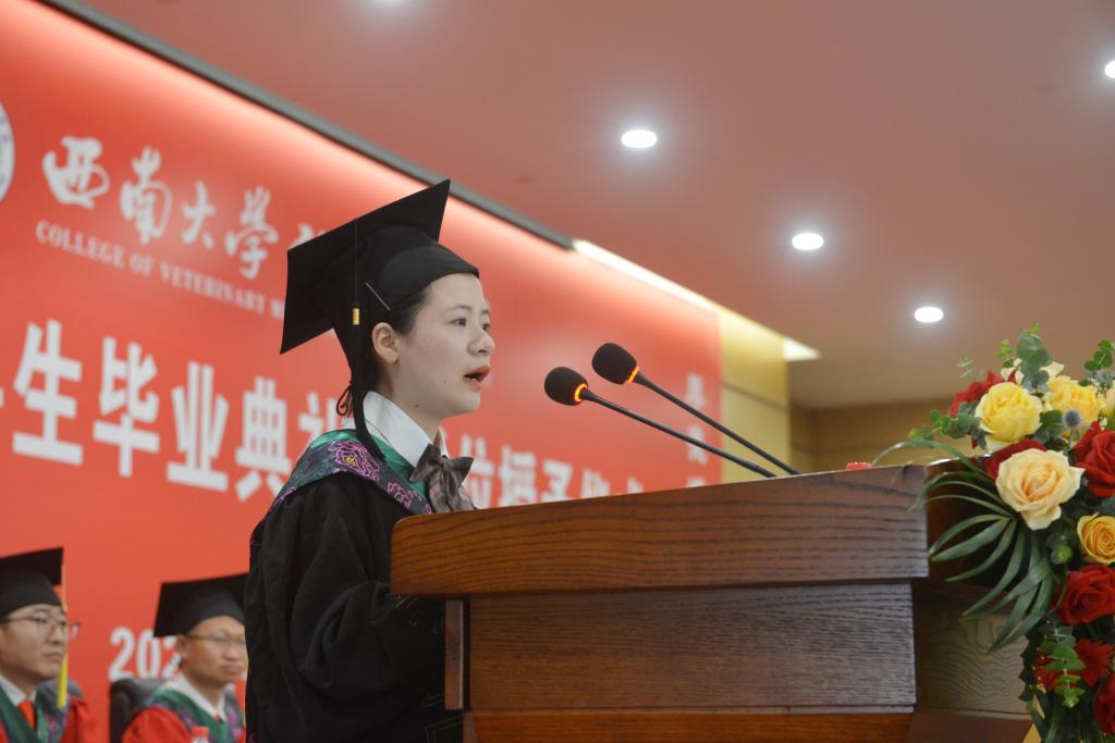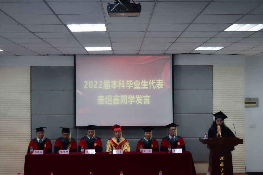 本科毕业生代表、重庆市优秀毕业生姚佳敏、秦绍鑫,毕业研究生代表黄云在仪式上深情发言,满怀对学校、学院的感激之情,表达了对学校、学院、老师和同学们的留恋和祝福;她们均表示将秉承“含弘光大 继往开来”的校训,牢记“厚德博学 笃行致新”的院训,立志做科技报国的西大学子,把实现中华民族伟大复兴作为奋斗目标,向学校和国家交出无愧于时代的答卷。