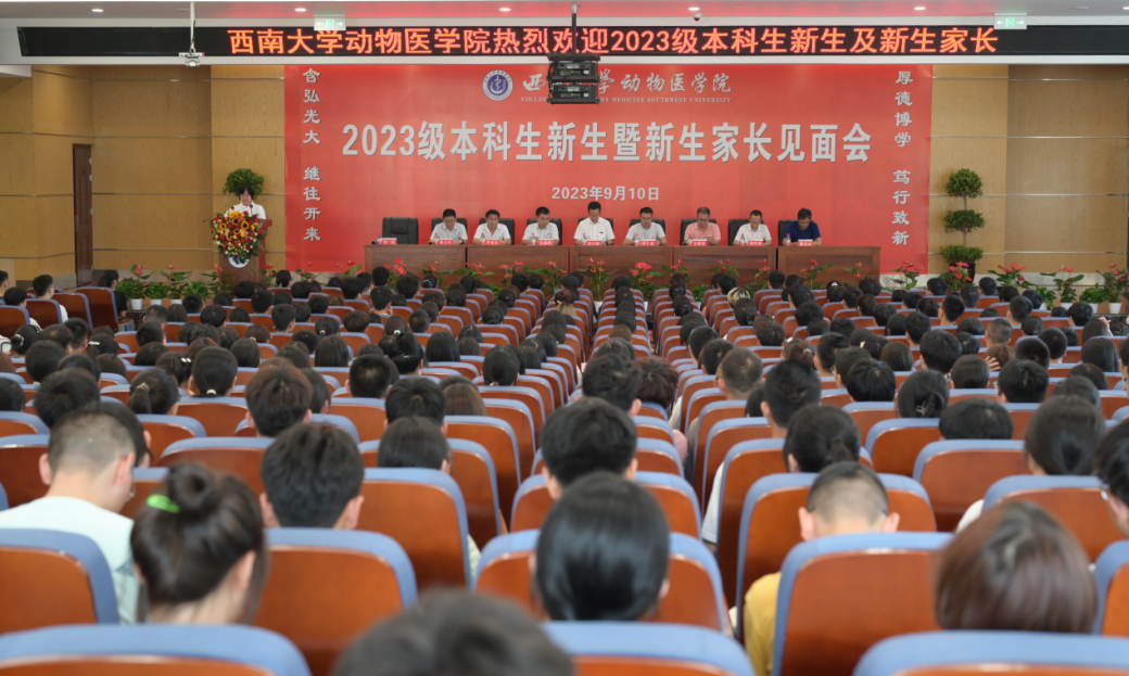 2023级本科生新生暨新生家长见面会在荣昌7B201报告厅隆重举行。学院党委书记黄昌建、院长方仁东、党委副书记罗丹、副院长宋振辉、基础兽医系主任王鲜忠、临床兽医系主任李前勇、预防兽医系主任周作勇、中兽医系主任曹立亭、动物药学系主任魏述永出席大会,参加本次见面会的还有学院科级干部、2023级辅导员和班主任、部分教师代表和学生代表、2023级378位本科新生及100余名新生家长。见面会由学院党委副书记、纪委书记罗丹主持。会议在全体人员奏唱«中华人民共和国国歌»的韵律中拉开帷幕。