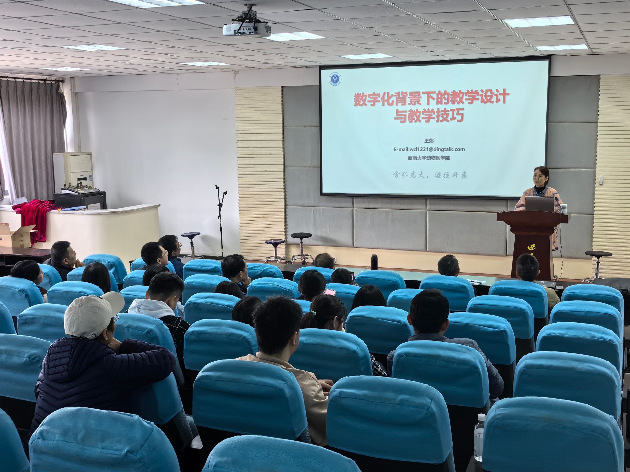 王炜副教授以“数字化背景下的教学设计与教学技巧”为题,向全系教师做了精彩报告。她首先介绍了高等教育数字化的发展趋势、所面临的挑战、变革方向与共识,并详细阐述了线上线下混合式一流课程的要求及特点,从课程的基本要素、课堂设计及课程教学基本流程、课程核心目标的凝练、课程内容的重塑和整合,以及线上教学资源的应用等多个方面进行讲述,并强调了结合本校实际进行课程重构的重要性;紧接着,王老师介绍了课程思政元素挖掘和融入策略,以“坚定学生理想信念、爱党、爱国、爱社会主义、爱人民、爱集体”为主线,阐述了课程思政的五大重点内容。最后,她以动物生物化学课程教学为例,介绍多种课程思政元素的挖掘方法,如纵向历史对比、横向国情对比、时事热点追踪、教学内容联想、学科专业典故及反面教材警示等,并就如何引导学生达成课前学习目标进行细致的讲解。
