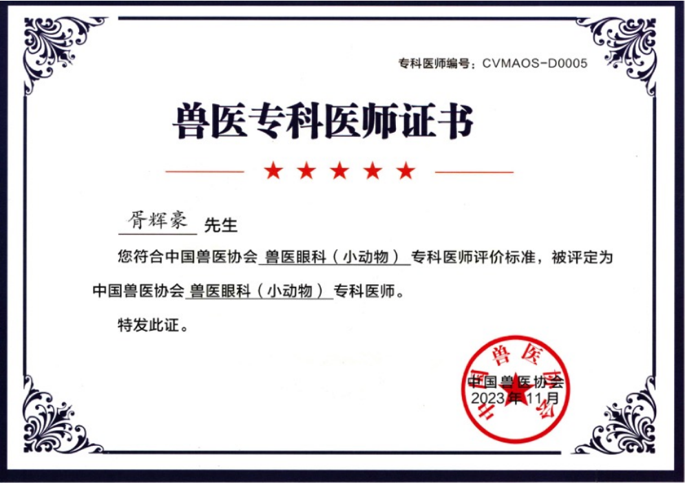 作为本次年会的一大亮点,中国兽医协会宣布了兽医眼科专科医生名单,并隆重颁发了相关证书。胥辉豪成为首批中国兽医学会兽医眼科(小动物)专科医师,他深刻认识到未来兽医发展的必然方向是专科化。作为小动物临床医学与眼科学骨干,胥辉豪深感责任重大。他表示将更加努力承担相关学科建设工作任务,进一步奠定51风流