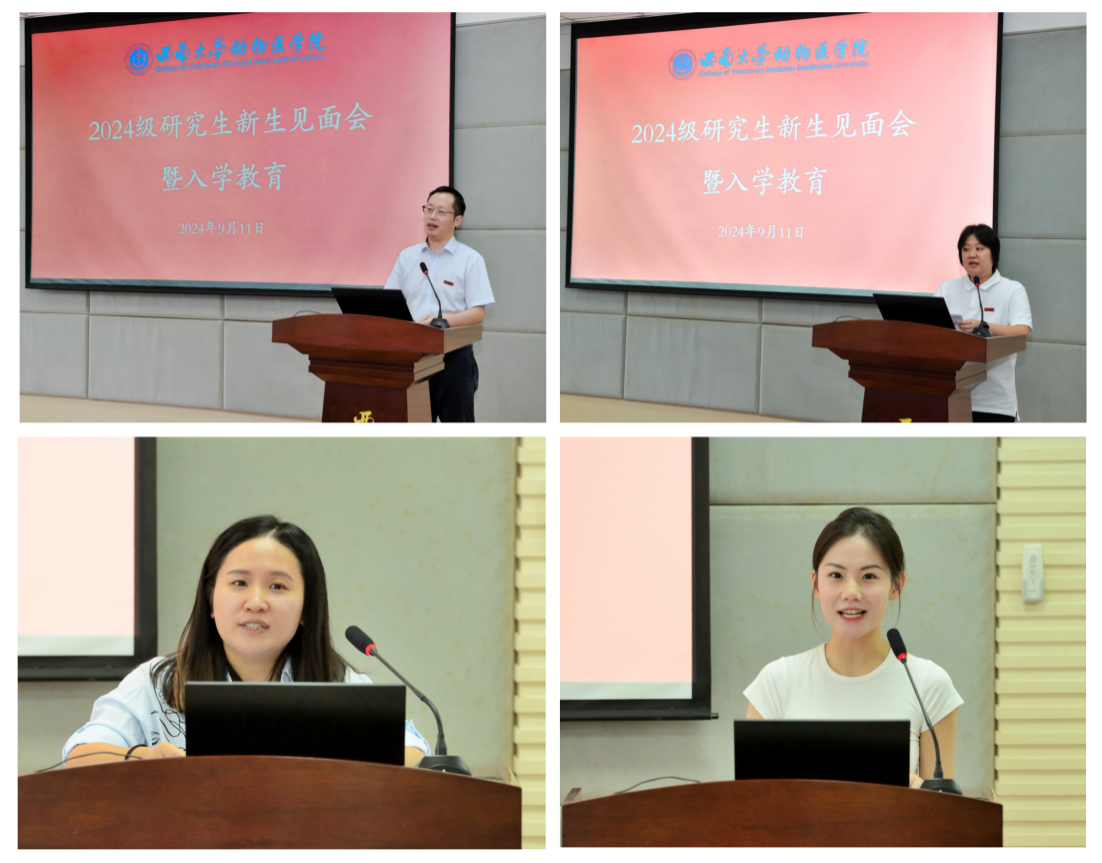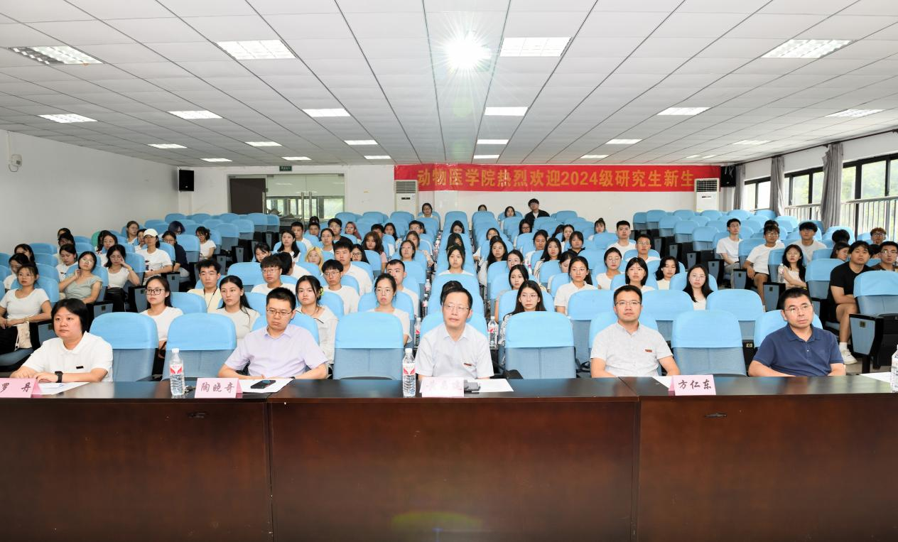 2024级研究生新生见面会于2024年9月11日下午在98教动物医院报告厅顺利举行。学院党委书记黄昌建,院长方仁东,党委副书记、纪委书记罗丹,副院长宋振辉,副院长陶晓奇出席会议,研究生导师代表,研究生教学秘书,辅导员,班主任等共同参加。会议由罗丹主持。会议在全体人员奏唱《中华人民共和国国歌》中拉开帷幕。