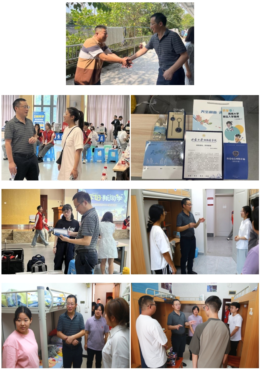 学院党政领导也莅临现场对迎新工作进行指导。党委书记黄昌建,党委副书记、纪委书记罗丹,在迎新工作开展地点与报道新生以及工作人员进行交流,仔细询问新生报到情况,指导迎新工作。随后黄书记一行到新生宿舍关心慰问新同学,并与学生及家长展开亲切交谈,细致了解新生报到状况,勉励同学们在未来的学习生活中锐意进取、不负青春韶华。