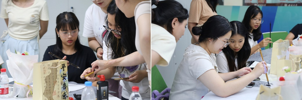“墨香润心,笔韵传情”,学院学生陈嘉鑫现场示范软笔书法技巧,带领5位泰国学生上了一堂“书法体验课”,生动展现了汉字书写的笔墨神韵与中华文化的独特魅力。