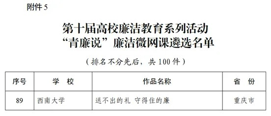 近日,教育部办公厅正式公布了第十届高校廉洁教育系列活动评选结果。学院党委选送的蒲友桢老师微网课作品《送不出的礼 守得住的廉》成功入选“青廉说”廉洁微网课优秀作品名单。这是学院在廉洁文化建设工作中取得的又一重要成果。