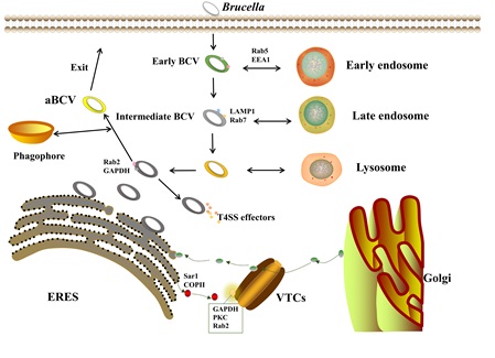 布鲁氏菌通过皮肤黏膜、消化道和呼吸道侵入宿主细胞后被膜包裹,形成含布鲁氏菌的液泡(Brucella-containing vacuole,BCV);再与内质网出口位点相互作用,形成复制型布鲁氏菌液泡(ER-derived replicativeBrucella-containing vacuole,rBCV);在内质网复制后,变为与自噬相关的布鲁氏菌液泡(autophagy-relatedBrucella-containing vacuole,aBCV),而后从靶细胞中排出,并开始新一轮的细胞内感染。VirB系统在rBCV的生物发生中起着至关重要的作用,VirB缺失株无法成功完成布鲁氏菌在靶细胞内的循环过程。