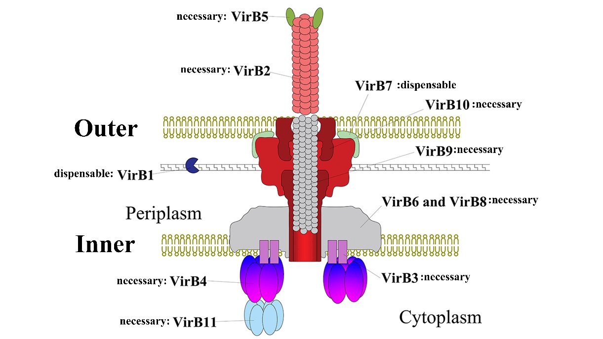 VirB系统由VirB1—VirB12组成,最初在猪种布鲁氏菌中发现,随后被证实存在于所有种的布鲁氏菌中,且高度保守。VirB操纵子中每个基因都有特定的功能,编码具有不同结构和功能的蛋白质。VirB蛋白质按其功能可分为四类:能量供给成分(VirB4和VirB11)、核心成分(VirB6—VirB0)、表面暴露成分(VirB2和VirB5)、其他成分(VirB1和VirB12)。