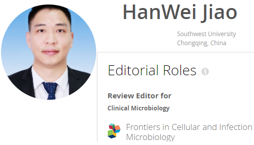 青年教师焦寒伟博士受邀担任国际知名学术期刊Frontiers in Cellular and Infection Microbiology的Review Editor(评审编辑),负责 Clinical Microbiology (临床微生物学)方面的组稿和同行评审工作。《Frontiers in Cellular and Infection Microbiology》期刊创刊于2011年,属于Frontiers 系列学术期刊,ISSN号:2235-2988,中文译作《细胞与感染微生物学前沿》,在免疫学和微生物学领域具有较大的影响力。