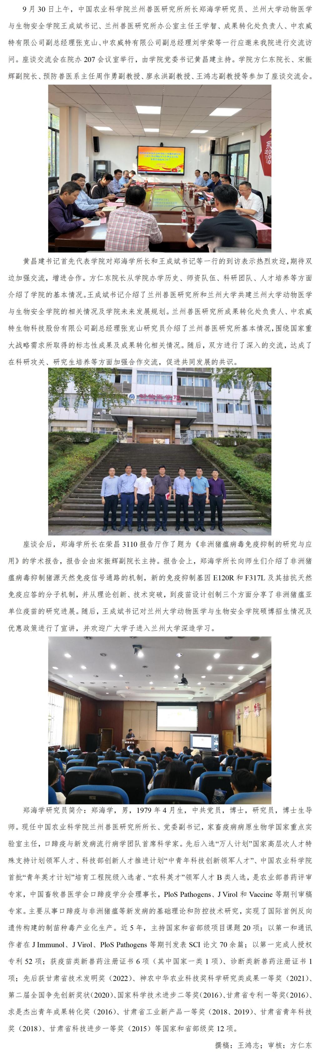 中国农业科学院兰州兽医研究所郑海学所长一行来51风流 交流并作学术报告