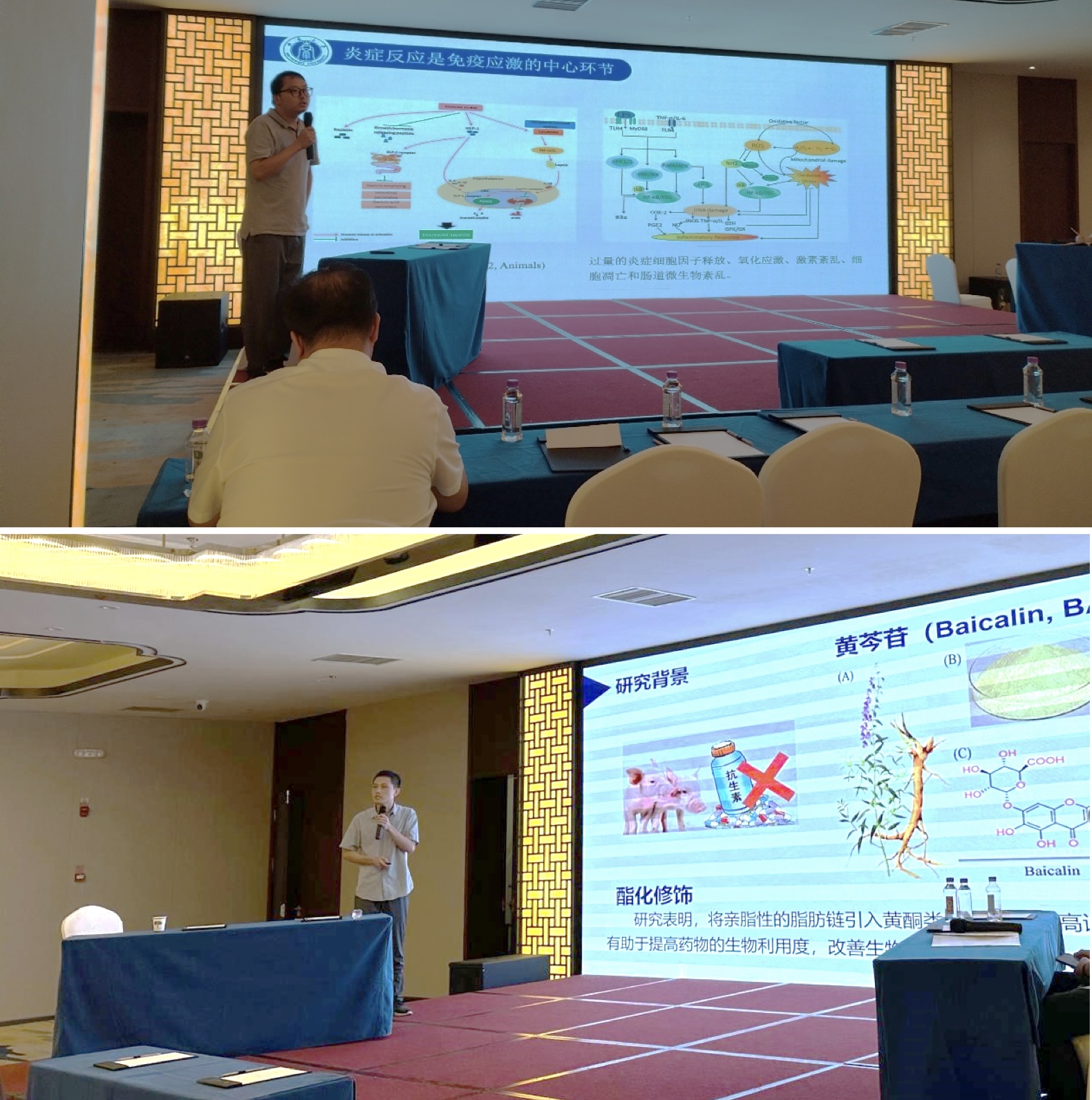 本次会议以“共话共商中兽医行业趋势,加快推进中兽药产业发展”为主题,围绕中兽医教学、科研、临床诊疗、兽药研发等教学科研成果与经验进行了学术交流和研讨。中兽医系毕师诚副教授以“中药干预肉鸡免疫应激的效果”为题做学术报告,就肉鸡免疫应激的肝脏营养代谢失调机制以及人参皂苷、赶黄草等中药提取物的干预效果进行了汇报,并与参会专家学者进行了交流。杜红旭博士做了题为“黄芩苷酯类衍生物的合成及其抗炎活性研究”的学术报告,主要对黄芩苷酯类衍生物的合成表征、鉴定及其体外抗炎活性筛选和作用机理探究等方面的最新研究成果进行了汇报交流。