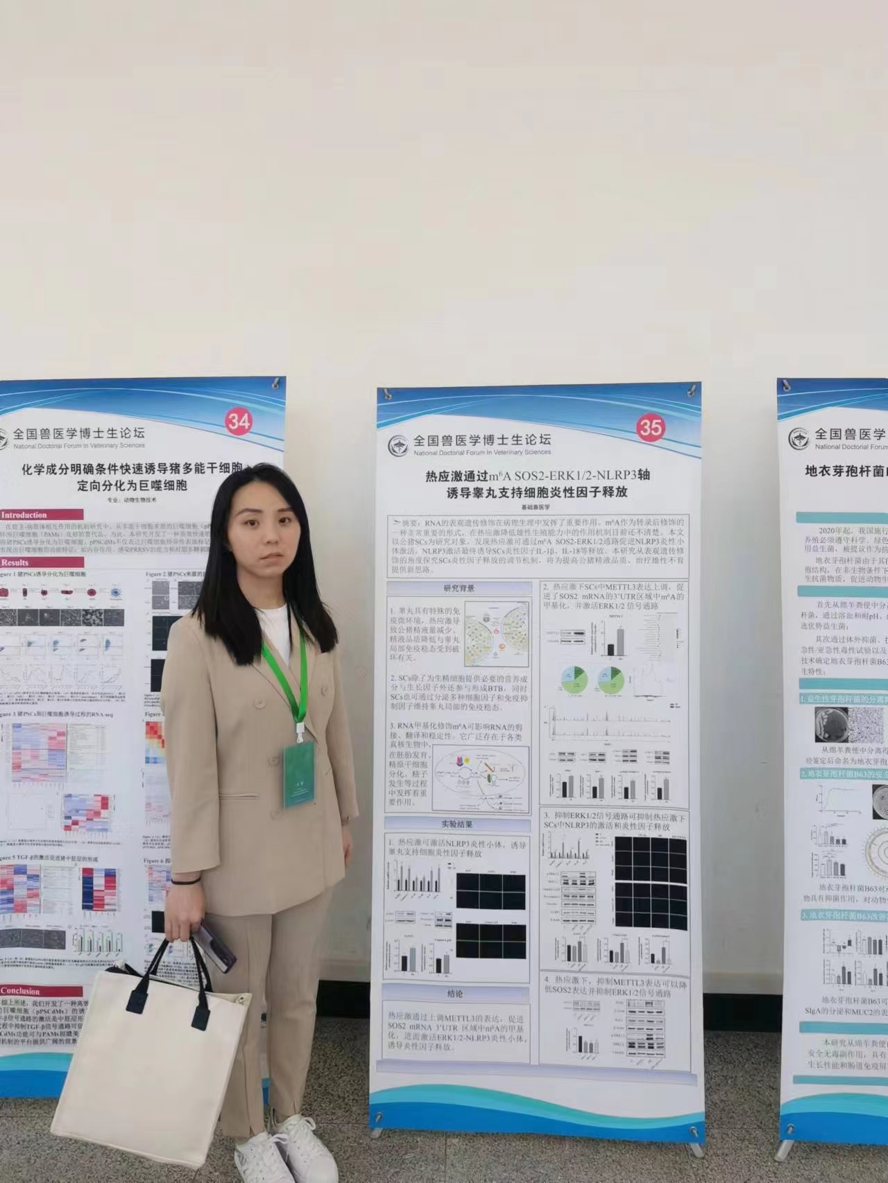 博士研究生张旭华以“热应激通过m6A SOS2-MAPK-NLRP3轴诱导睾丸支持细胞炎性因子释放”为题进行墙报展示并讲解汇报。