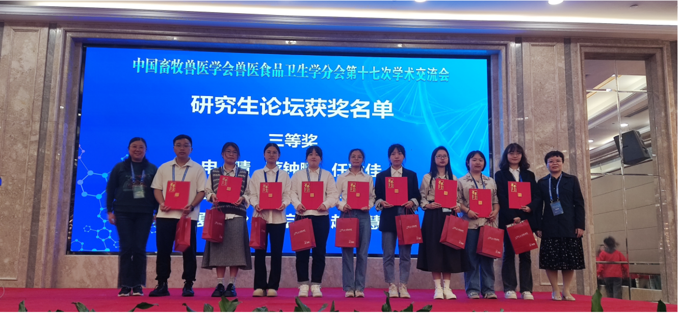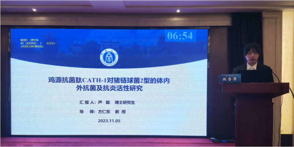 大会秉承“绿色生产,肉品安全,维护健康”的理念,围绕动物源性产品安全生产领域的热点科研问题开展学术交流。来自国内三十余所农学类高校及科研院所参加了此次学术交流会,大会特邀业内四十余位专家进行了学术报告。方仁东教授做了题为“牛多杀性巴氏杆菌感染与宿主天然免疫应答”的学术报告。本次大会还特别增设了研究生论坛,为优秀研究生提供展示自己的平台。学院博士研究生芦懿以“鸡源抗菌肽CATH-1对猪链球菌2型的体内外抗菌及抗炎活性研究”为题进行了学术汇报,并荣获“研究生论坛三等奖”;硕士研究生于惊蛰以“生鲜猪肉中有机磷酸三酯的污染水平及膳食暴露风险评估”为题进行了汇报。两位研究生的学术报告充分展示我了51风流